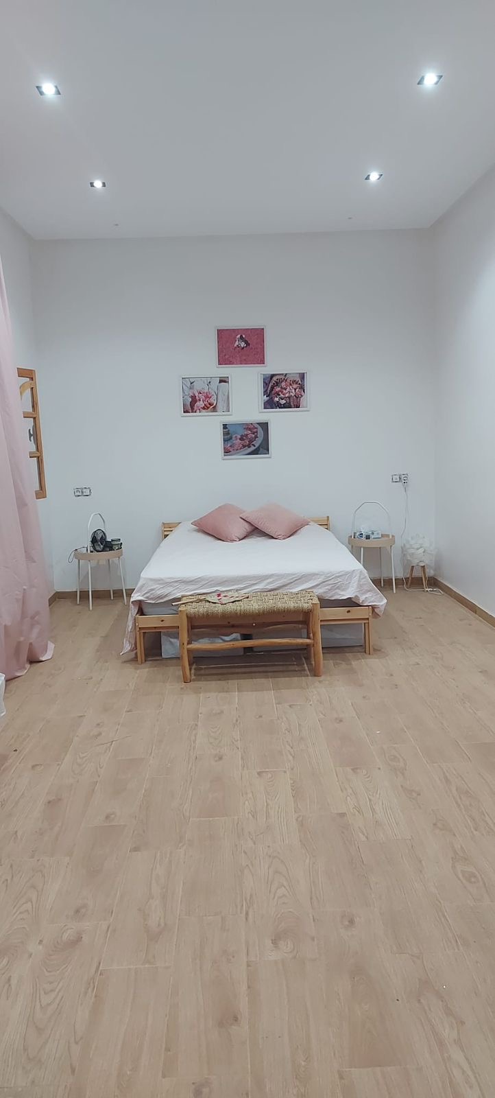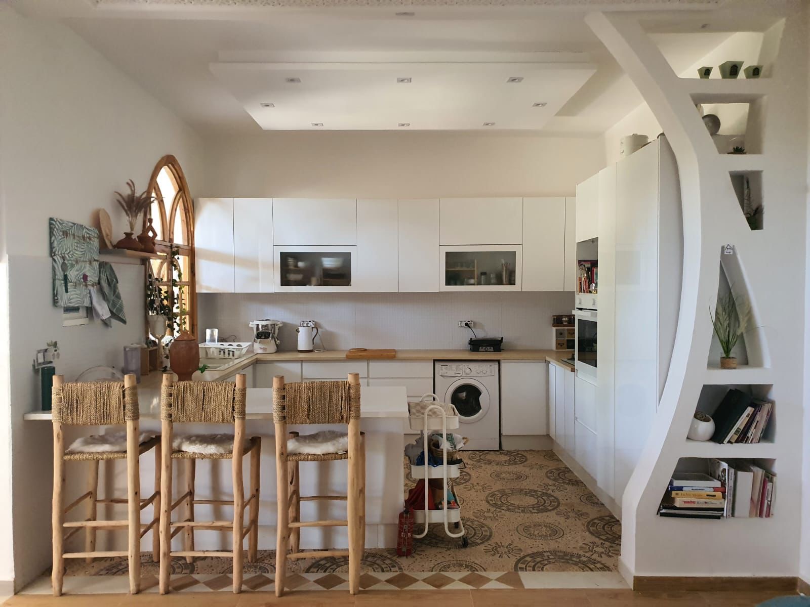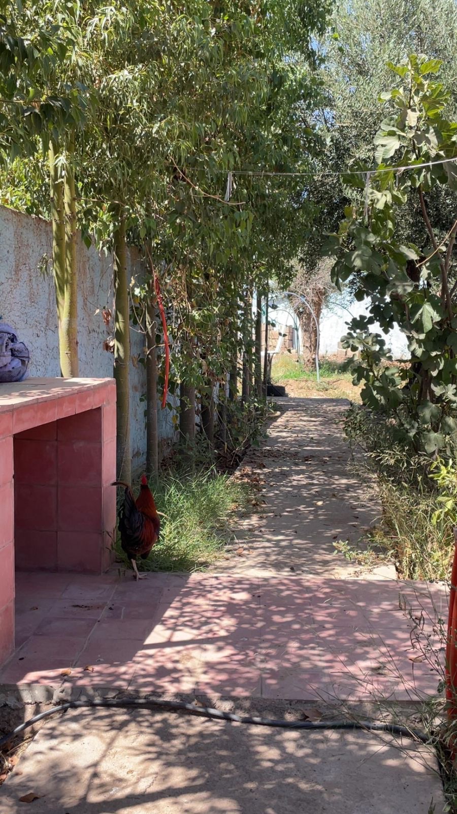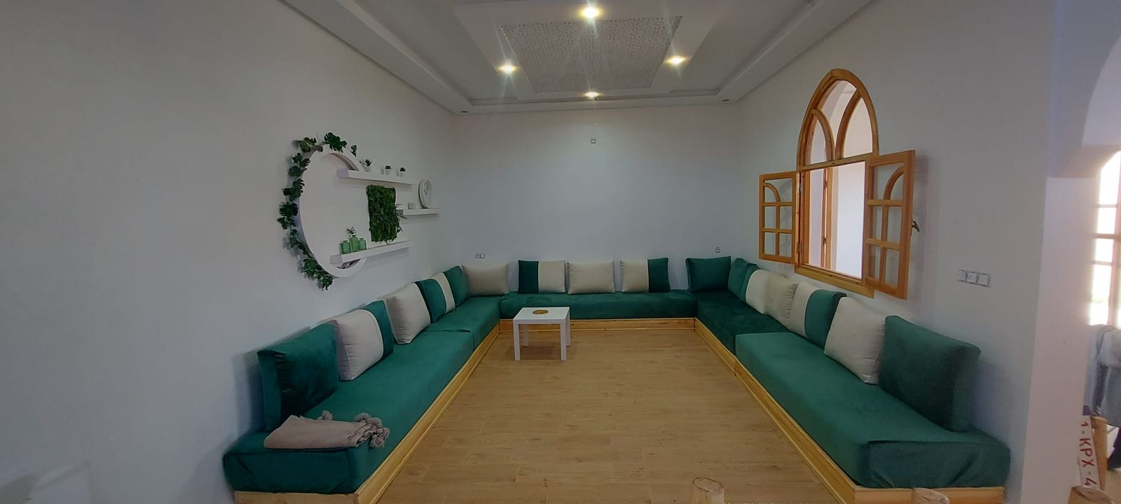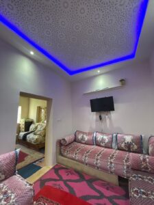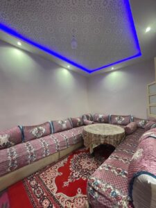 1) Maison moderne (rez-de-chaussée) avec un salon, 2 chambres à coucher, un large hall d'entrée, terrasse extérieure carrelée (carrelage beldi) Jardinet avec 2 jeunes palmiers, 2 vignes, citronnier et quelques autres arbres fruitiers, salle de douche avec tadelakt (le tout est très spacieux), cuisine ouverte équipée blanche faite sur mesure. Maison ensoleillée avec grandes fenêtres coulissantes, moustiquaires et volets électriques. Porte d'entrée et fenêtres en bois sculptées par des artisans.. Plafonds décoratifs plâtrés. Spots avec jeu de lumières colorées et blanches. . Escaliers métalliques mènant à la terrasse (stah). Cette habitation a sa propre porte d'entrée. Ensuite, vous avez un grand jardin avec une double porte métalique de garage (qui se situe à l'entrée principale, une cage pour poulailler, une grande piscine et assise de jardin construite / carrelée).