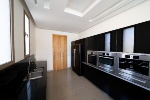 La villa est en excellent état et a été récemment rénovée. Elle offre un hall d’entrée menant à un vaste salon avec cheminée, une salle à manger avec cuisine ouverte, ainsi qu’une cuisine de service.